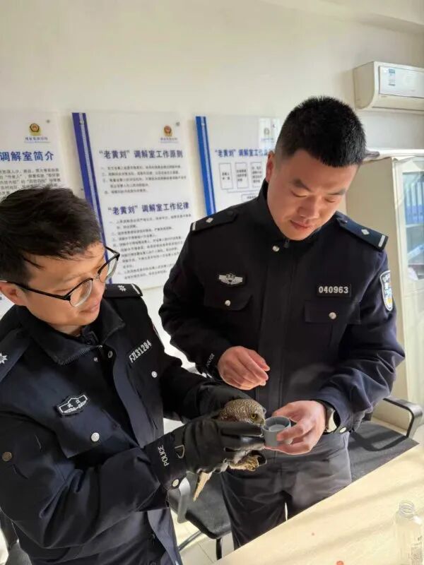 民警辅警照料斑头鸺鹠。 通讯员舒星 摄